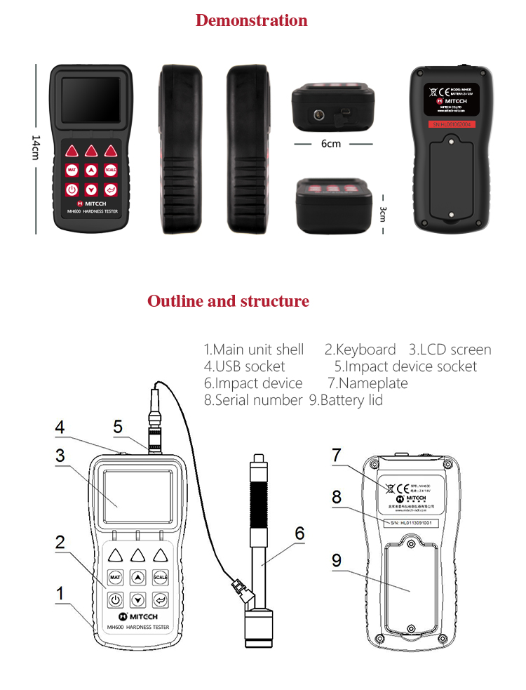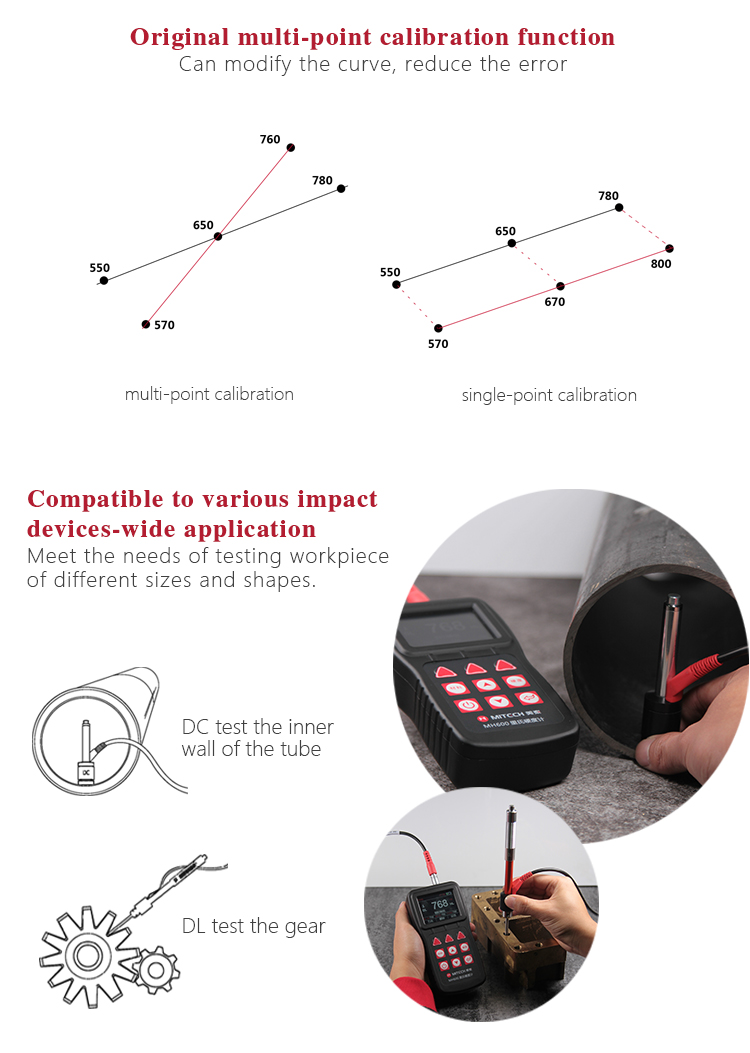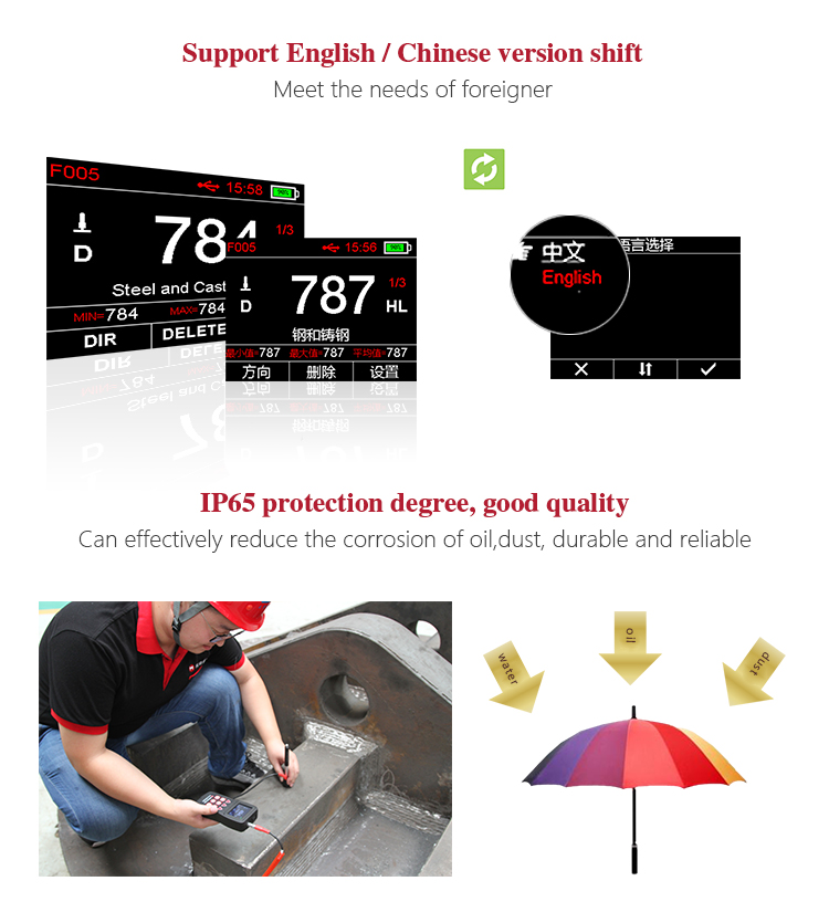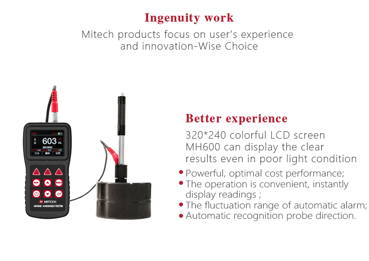 MH600 portable Leeb hardness tester, intelligent design can be quickly and easily for on-site testing of metal hardness. IP65 protection, can effectively prevent oil, dust and other corrosion in harsh field environments; with color LCD display, it can also display clear testing results in dim light and strong sunlight environment , which greatly enhance the visual experience; specil multi- point calibration function for convert curve to reduce errors;it can automatically identify the measuring direction when testing, automatically alarm when out of range, to meet the inspection requirements with high precision and multi-angle material collected and support free Conversion between hardness scale; low power consumption design by two AA batteries, support multiple languages. It is widely used in metal processing and manufacturing, special equipment or permanent component failure analysis in service, inspection and other fields. Particularly suitable for large non-removable part of the site hardness testing. It is necessary professional precision instrument to improve the pass rate of production and cost savings .