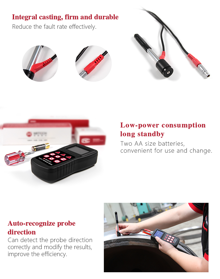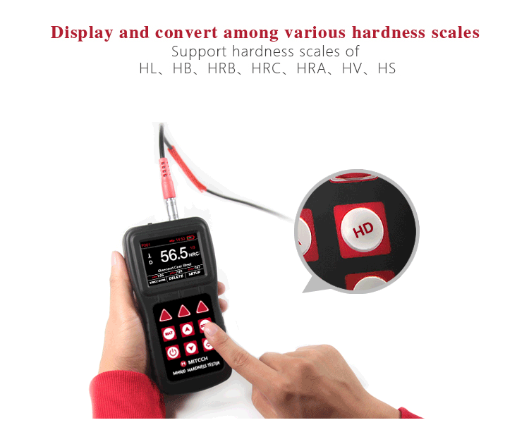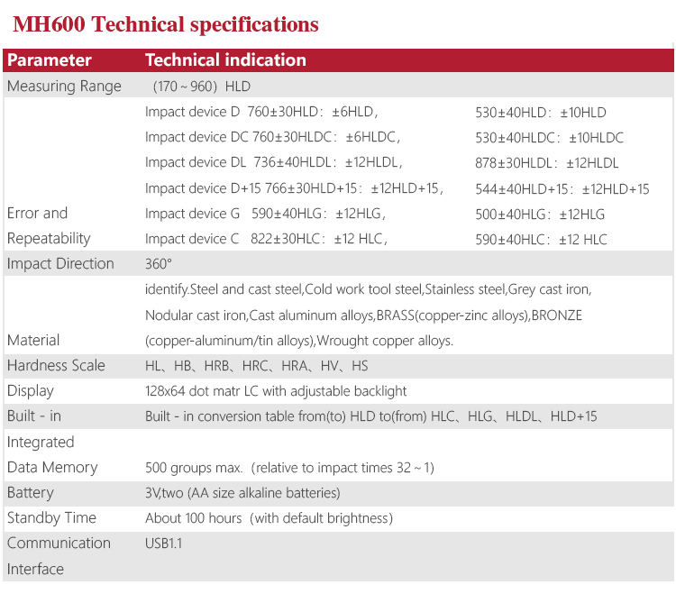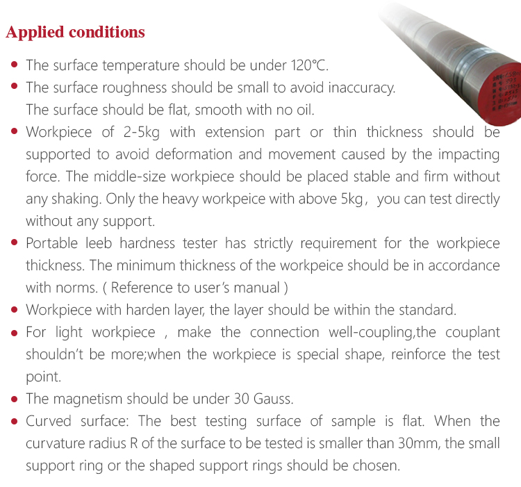 Based on the principle of Leeb hardness testing principle. It can measure the Leeb hardness of all metallic materials.