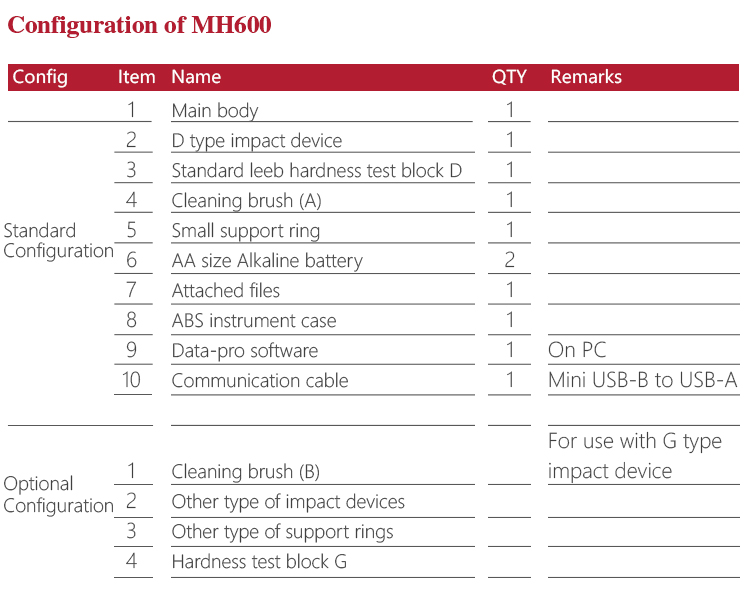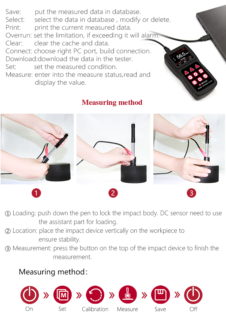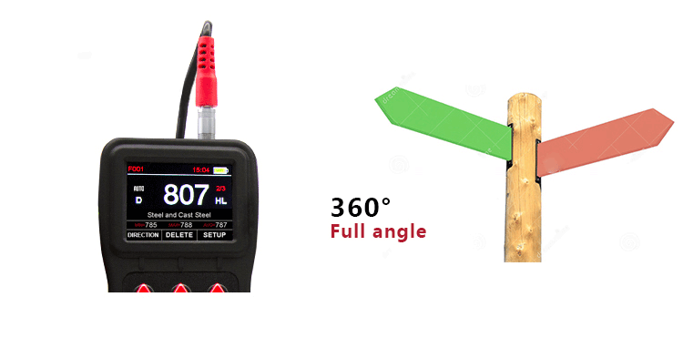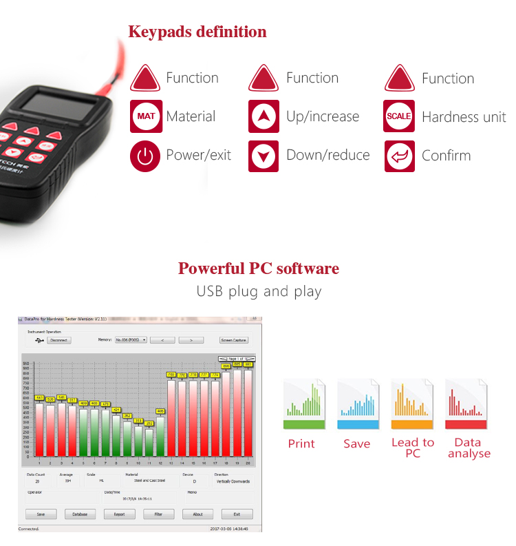 It can store 500 groups (impact times 32 ~ 1) hardness values, each data includes single testing value, average value,  measurement date / time, impact direction, frequency, material, hardness and other information.