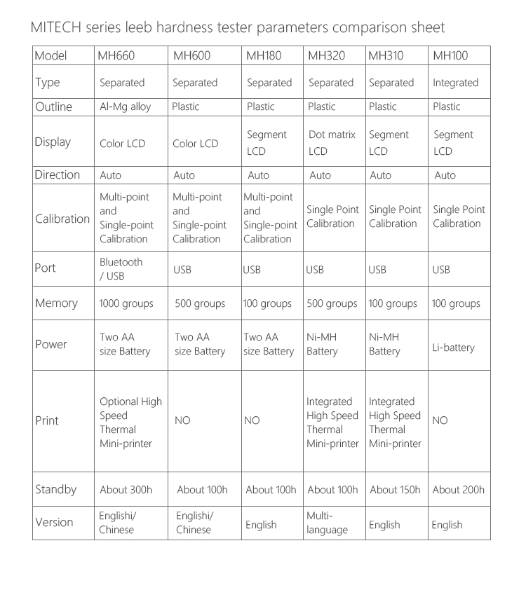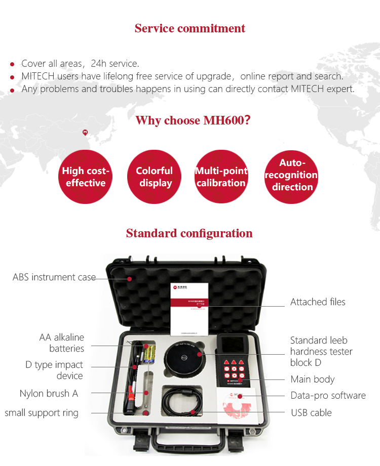Mitech portable Leeb hardness testers,with low-power consumption design and long standby, MH180/MH200/MH600/MH660 all adopt two AA size alkaline batteries for power supply.