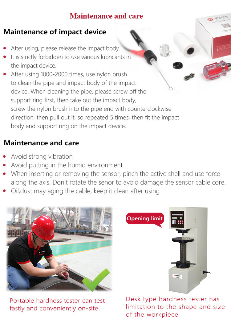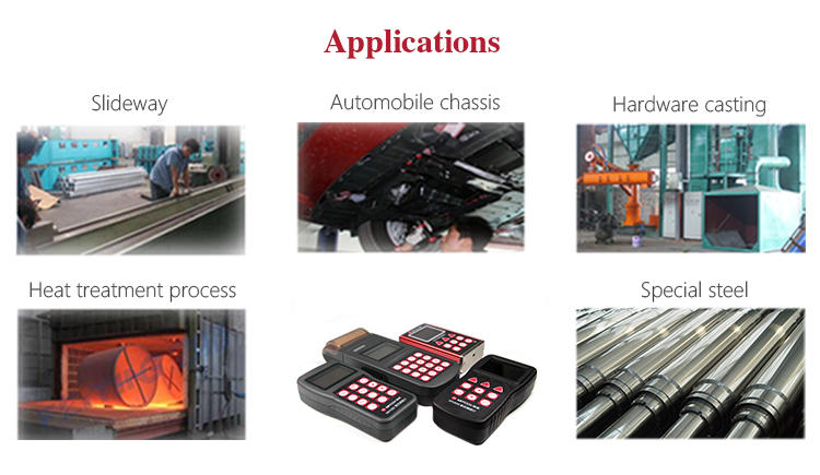 Main applications:car chassis hardness testing;the installed machinery and permanently assembled parts;rapid testing in large range and multi-measuring areas for large-scale work piece;failure analysis of pressure vessel, steam generator and other equipment;bearings and other parts;material identification in the warehouse of metallic materials;heat treatment workpiece of quality control;