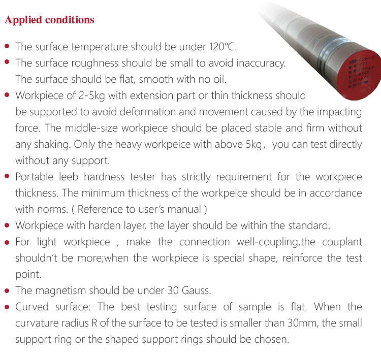 ---- If want accurate conversion from the Leeb hardness value to other hardness value, contrastive test is needed to get conversion relations for the special material. Use inspection qualified Leeb hardness tester and corresponding hardness tester to test at the same sample respectively. For each hardness value, each measure homogeneously 5 points of Leeb hardness value in the surrounding of more than three indentations which need conversion hardness, using Leeb hardness arithmetic average value and corresponding hardness average value as correlative value respectively, make individual hardness contrastive curve. Contrastive curve at least should include three group of correlative data.