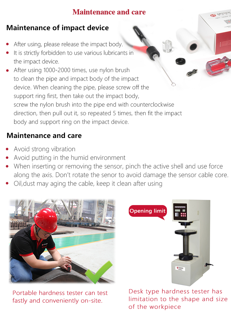 The DL type impact device of Mitech portable hardness tester, height 204mm, weight 50g, diameter 20mm, has build-in DL impact body, front side is slim device, it is suitable for hardness measurement of the narrow parts (like holes, slits) of the workpiece with weight above 5kg, thickness above 5mm. It is widely used for the narrow part of the installed machinery or permanently assembled parts, rapidly testing for multiple measuring parts in large range of the large-scale workpiece, hardness testing for gear tooth root and other slender narrow grooves or hole. It can realize the precise measurements for Leeb, Brinell, Rockwell and others.