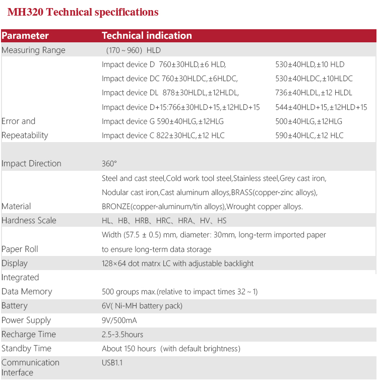 MH320 portable Leeb hardness tester is based on Leeb hardness measurement principle, it can be quickly and easily used for on-site testing hardness of metallic materials and support free conversion between Leeb, Brinell, Rockwell hardness and other scales. It uses 128 × 64 dot matrix LCD screen, rich information, intuitive, stable performance and integrated high-speed thermal printer, which enables printing with instant measurement results.It can be widely used in metal processing and manufacturing, special equipment, permanent component failure analysis, inspection and other fields. It is particularly suitable for large parts and non-removable part of the on-site hardness testing. It is to improve production efficiency and pass rate and is a wise choice to save the cost of production.