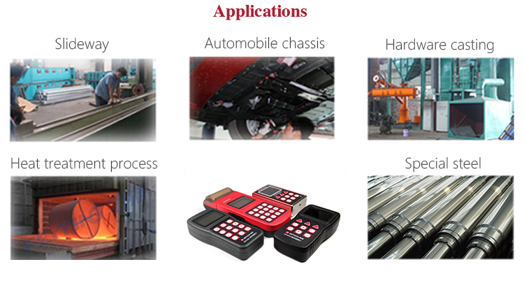 Main applications:car chassis hardness testing;the installed machinery and permanently assembled parts;rapid testing in large range and multi-measuring areas for large-scale work piece;failure analysis of pressure vessel, steam generator and other equipment;bearings and other parts;material identification in the warehouse of metallic materials;heat treatment workpiece of quality control;
