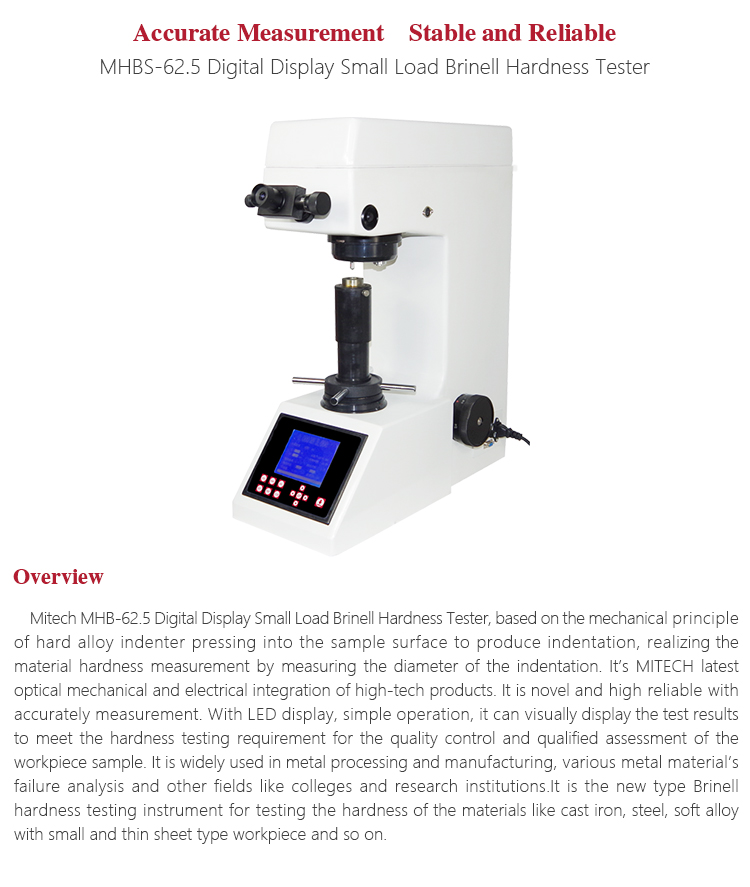 Product OverviewMitech MHB-62.5 Digital Display Small Load Brinell Hardness Tester, based on the mechanical principle of hard alloy indenter pressing into the sample surface to produce indentation, realizing the material hardness measurement by measuring the diameter of the indentation. It’s MITECH latest optical mechanical and electrical integration of high-tech products. It is novel and high reliable with accurately measurement. With LED display, simple operation, it can visually display the test results to meet the hardness testing requirement for the quality control and qualified assessment of the workpiece sample. It is widely used in metal processing and manufacturing, various metal material’s failure analysis and other fields like colleges and research institutions.It is the new type Brinell hardness testing instrument for testing the hardness of the materials like cast iron, steel, soft alloy with small and thin sheet type workpiece and so on.