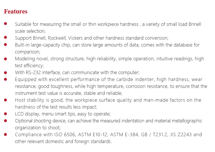 l Compliance with ISO 6506, ASTM E10-12, ASTM E-384, GB / T231.2, JIS Z2243 and other relevant domestic and foreign