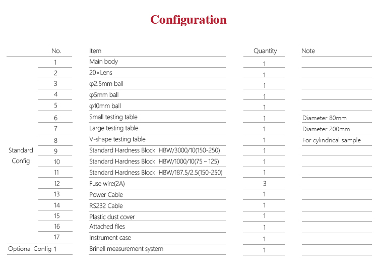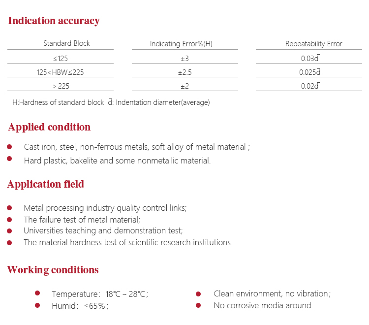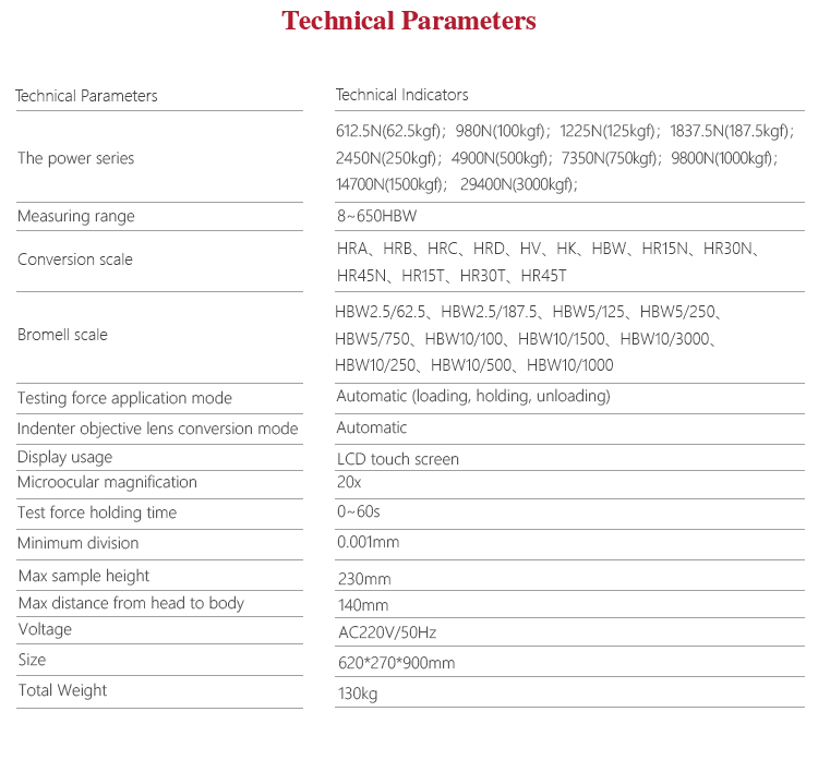 | Brinell scale | HBW2.5/62.5、HBW2.5/187.5、HBW5/125、HBW5/250、 HBW5/750、HBW10/100、HBW10/1500、HBW10/3000、 HBW10/250、HBW1 |