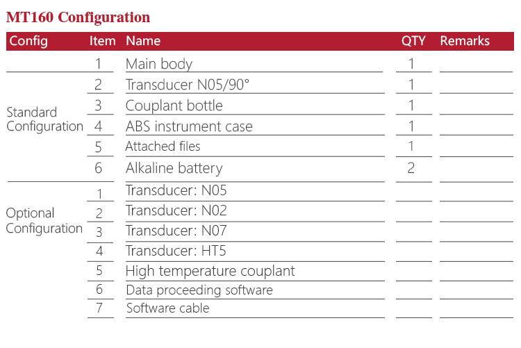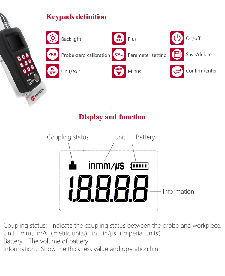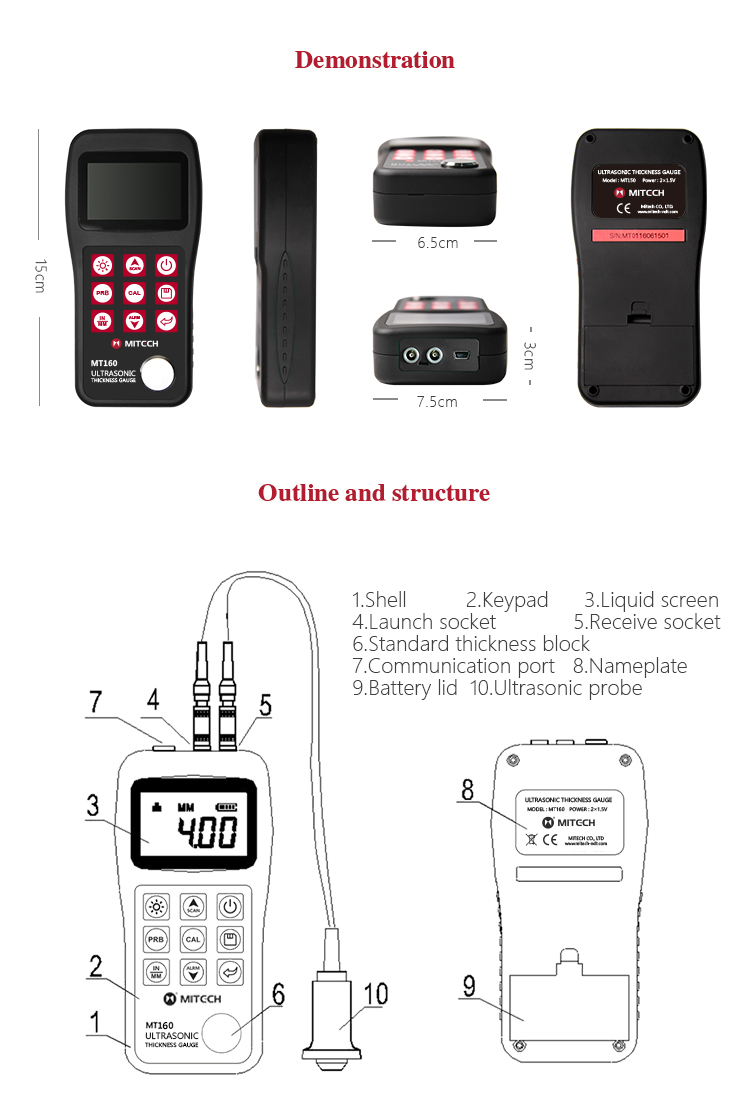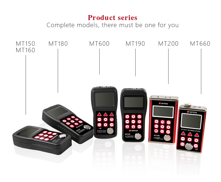 Product OverviewThe model MT160 is a digital ultrasonic thickness gauge .Based on the principle of ultrasonic principle, the instrument is capable of measuring the thickness of various materials, such as metal, plastic, ceramic, glass and many other good ultrasonic conductors. It of all kinds of materials. Compared with the traditional measurement methods, the advantages of ultrasonic thickness gauge is exposed to one side of the workpiece to complete the measurement. Its unique non-destructive testing performance provide the perfect solution for the thickness testing of closed pipes, containers, etc. It is widely used in pertroleum , chemical ,metallurgy, shipbuilding, aviation, aerospace and other fields because of monitoring corrosion thinning degree of various pipes and pressure vessels. It can also be used for precise measurement of sheet metal and machined parts.