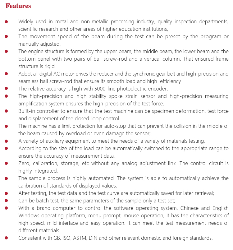 Function & applicationWidely used in metal, non-metallic and composite materials, pull, pressure, bending and other mechanical properties test.