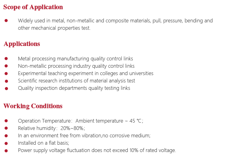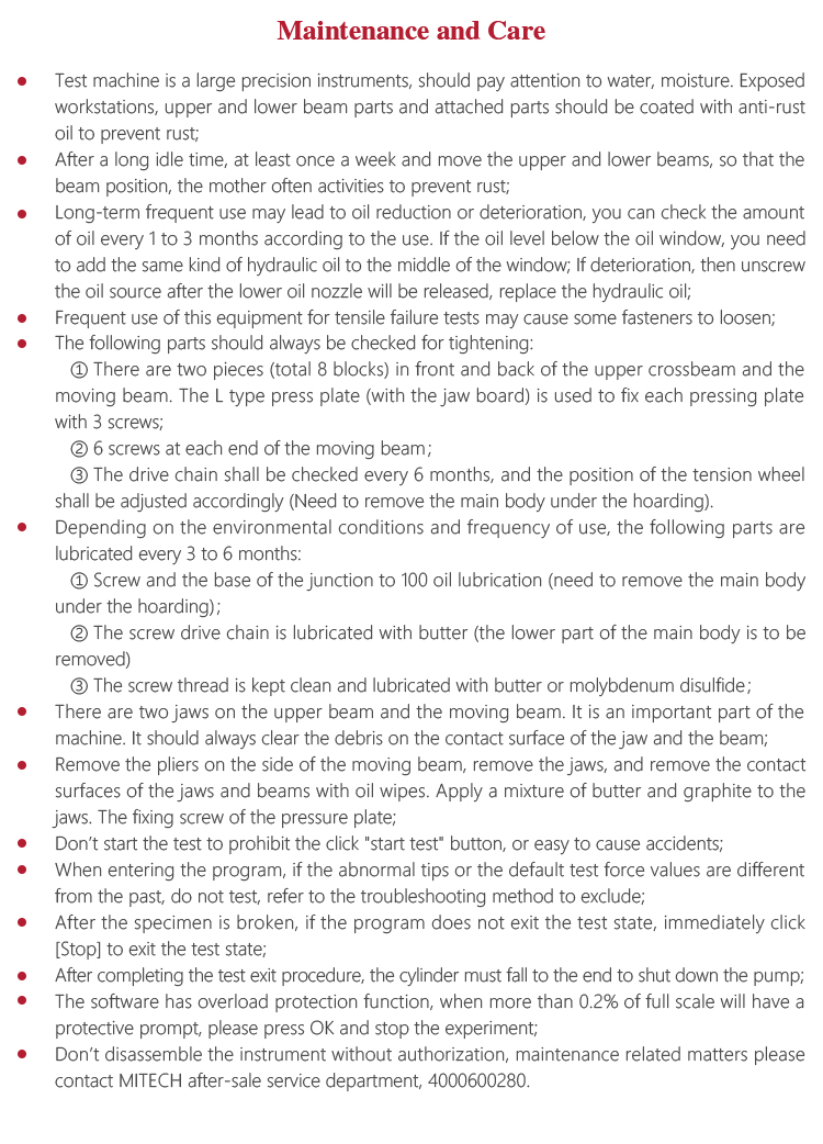 Instrument Maintenancel Test machine is a large precision instruments, should pay attention to water, moisture. Exposed workstations, upper and lower beam parts and attached parts should be coated with anti-rust oil to prevent rust;