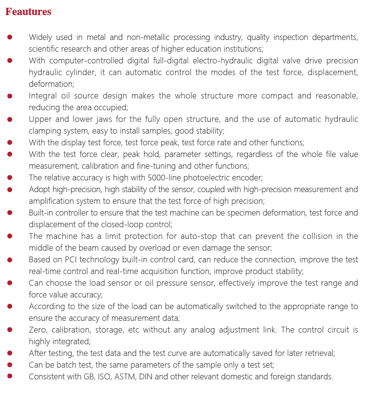 l With computer-controlled digital full-digital electro-hydraulic digital valve drive precision hydraulic cylinder, it can automatic control the modes of the test force, displacement, deformation.