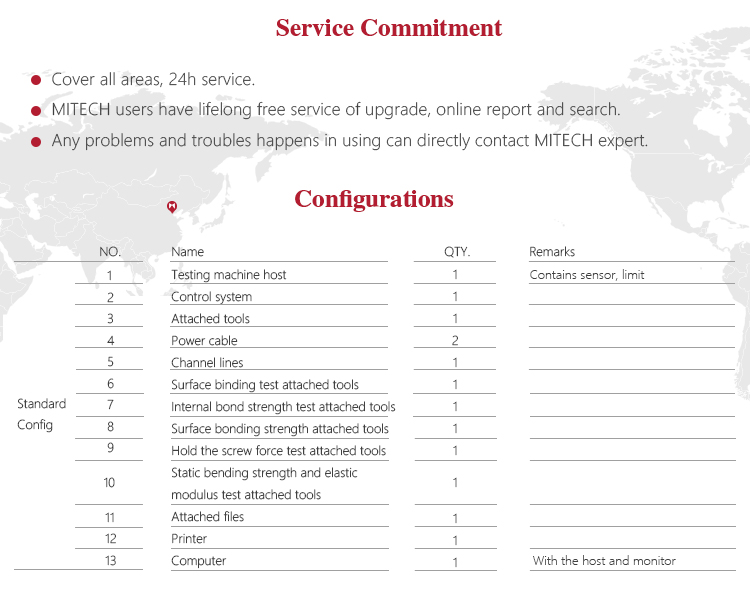 Product OverviewMitech MDW-M series of micro control wood-based universal testing machine, through the single-chip automatic control motor driving screw movement, can do various of physical and chemical properties of the test for wood-based panels and decorative panels. With built-in controller, AC servo motor, automatic control and data acquisition system, stable performance, strong structure, high reliability, simple operation, high degree of automation, it widely used in the wood-based panels and decorative panels of the internal bond strength, surface bonding strength, tensile strength test, bending test, elastic modulus test, grip force test and plywood shear cut test. It is a necessary professional precision testing equipment for improve production efficiency and save production costs.