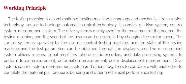 The testing machine is a combination of testing machine technology and mechanical transmission technology, sensor technology, automatic control technology. It consists of drive system, control system, measurement system. The drive system is mainly used for the movement of the beam of the testing machine, and the speed of the beam can be controlled by changing the motor speed. The control system is operated by the console control testing machine, and the state of the testing machine and the test parameters can be obtained through the display screen.The measurement system utilizes sensors, signal amplifiers, photoelectric encoders, and data processing systems to perform force measurement, deformation measurement, beam displacement measurement. Drive system, control system, measurement system and other subsystems to coordinate with each other to complete the material pull, pressure, bending and other mechanical performance testing.