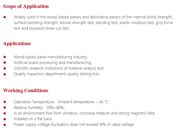 Instrument Featuresl Widely used in the wood-based panels and decorative panels of the internal bond strength, surface bonding strength, tensile strength test, bending test, elastic modulus test, grip force test and plywood shear cut test;