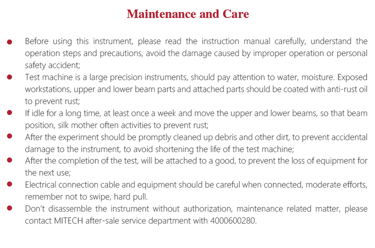 l Test machine is a large precision instruments, should pay attention to water, moisture. Exposed workstations, upper and lower beam parts and attached parts should be coated with anti-rust oil to prevent rust;