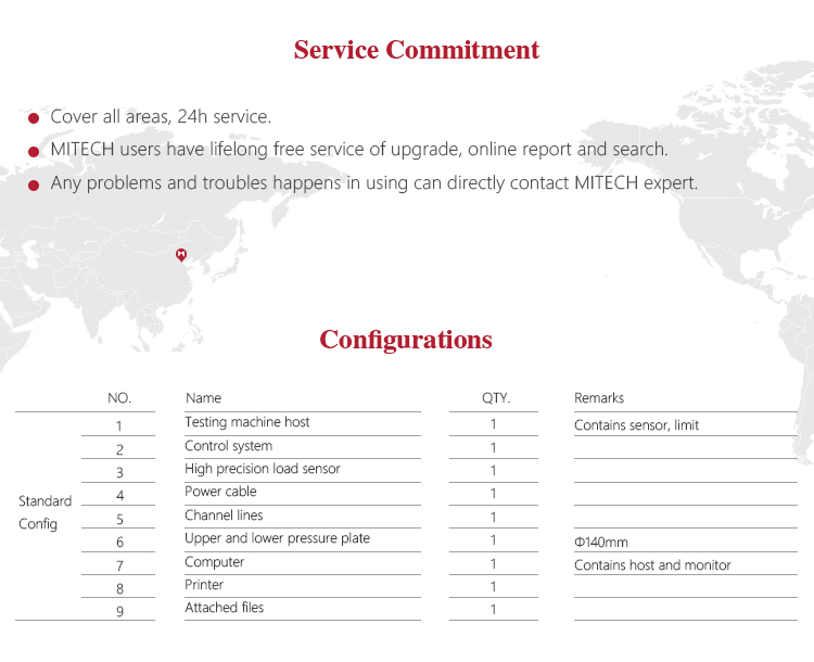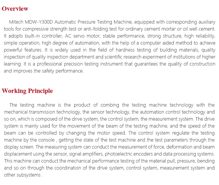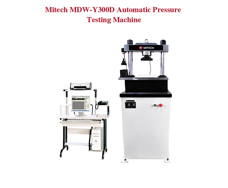 Mitech MDW-Y300D Automatic Pressure Testing Machine, equipped with corresponding auxiliary tools for compressive strength test or anti-folding test for ordinary cement mortar or oil well cement. It adopts built-in controller, AC servo motor, stable performance, strong structure, high reliability, simple operation, high degree of automation, with the help of a computer aided method to achieve powerful features. It is widely used in the field of hardness testing of building materials, quality inspection of quality inspection department and scientific research experiment of institutions of higher learning. It is a professional precision testing instrument that guarantees the quality of construction and improves the safety performance.