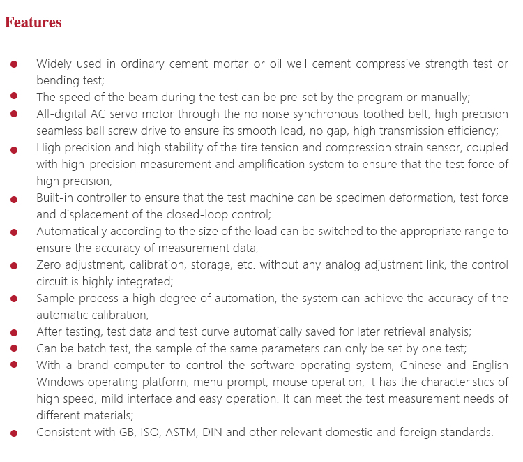 Instrument Featuresl Widely used in ordinary cement mortar or oil well cement compressive strength test or bending test;