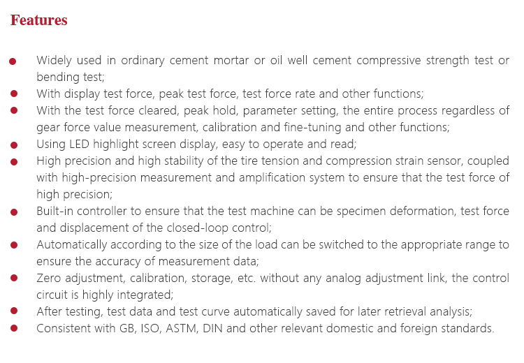 Instrument Featuresl Widely used in ordinary cement mortar or oil well cement compressive strength test or bending test;