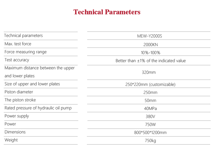 Product OverviewMitech MEW-Y2000S Digital Pressure Testing Machine, by controlling the high pressure oil pump drives the piston movement, equipped with corresponding auxiliary equipment for ordinary or oil well cement on the compressive strength of mortar test or bending test. With digital processing, high precision data acquisition control technology, graphical interface, integrated design, stable performance, solid construction and high reliability, simple operation, it is widely used in the field of hardness testing of building materials, quality inspection of quality inspection department and scientific research experiment of institutions of higher learning. It is a professional precision testing instrument that guarantees the quality of construction and improves the safety performance.
