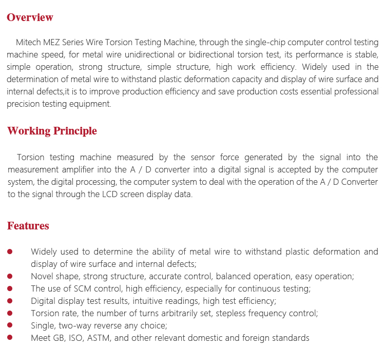 Mitech MEZ Series Wire Torsion Testing Machine, through the single-chip computer control testing machine speed, for metal wire unidirectional or bidirectional torsion test, its performance is stable, simple operation, strong structure, simple structure, high work efficiency. Widely used in the determination of metal wire to withstand plastic deformation capacity and display of wire surface and internal defects,it is to improve production efficiency and save production costs essential professional precision testing equipment.