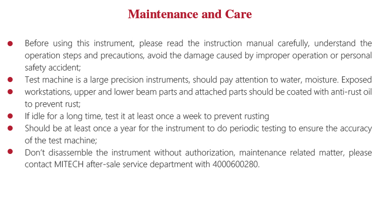 l Test machine is a large precision instruments, should pay attention to water, moisture. Exposed workstations, upper and lower beam parts and attached parts should be coated with anti-rust oil to prevent rust;