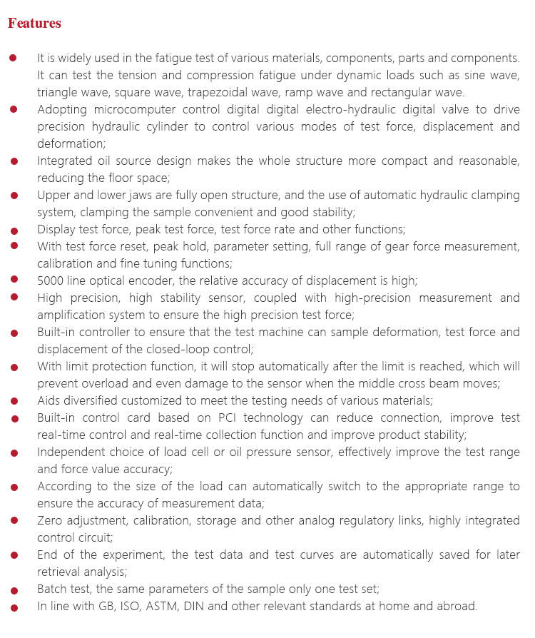Instrument Features<!--[if !supportLists]-->l <!--[endif]-->It is widely used in the fatigue test of various materials, components, parts and components. It can test the tension and compression fatigue under dynamic loads such as sine wave, triangle wave, square wave, trapezoidal wave, ramp wave and rectangular wave.