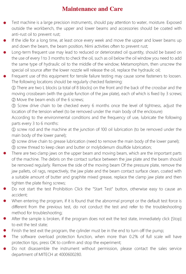 l Test machine is a large precision instruments, should pay attention to water, moisture. Exposed outside the workbench, the upper and lower beams and accessories should be coated with anti-rust oil to prevent rust;