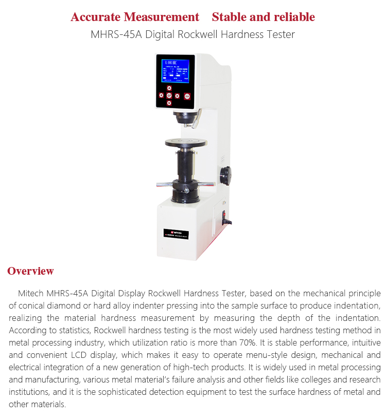 Product OverviewMitech MHRS-45A Digital Display Rockwell Hardness Tester, based on the mechanical principle of conical diamond or hard alloy indenter pressing into the sample surface to produce indentation, realizing the material hardness measurement by measuring the depth of the indentation. According to statistics, Rockwell hardness testing is the most widely used hardness testing method in metal processing industry, which utilization ratio is more than 70%. It is stable performance, intuitive and convenient LCD display, which makes it easy to operate menu-style design, mechanical and electrical integration of a new generation of high-tech products. It is widely used in metal processing and manufacturing, various metal material’s failure analysis and other fields like colleges and research institutions, and it is the sophisticated detection equipment to test the surface hardness of metal and other materials.