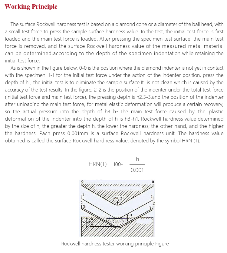 Working PrincipleThe surface Rockwell hardness test is based on a diamond cone or a diameter of the ball head, with a small test force to press the sample surface hardness value. In the test, the initial test force is first loaded and the main test force is loaded. After pressing the specimen test surface, the main test force is removed, and the surface Rockwell hardness value of the measured metal material can be determined,according to the depth of the specimen indentation while retaining the initial test force.