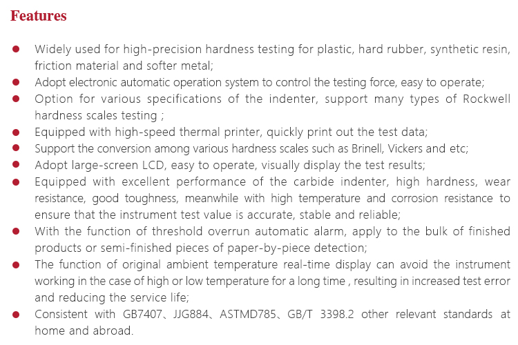 l Option for various specifications of the indenter, support many types of Rockwell hardness scales testing ;
