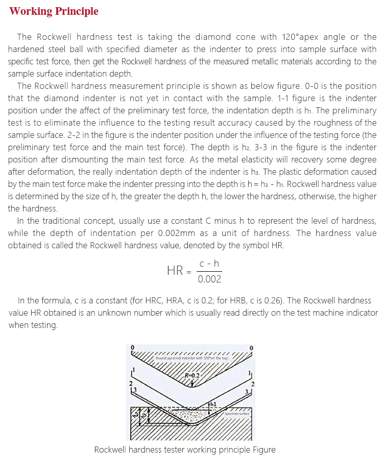 In the formula, c is a constant (for HRC, HRA, c is 0.2; for HRB, c is 0.26). The Rockwell hardness value HR obtained is an unknown number which is usually read directly on the test machine indicator when testing.