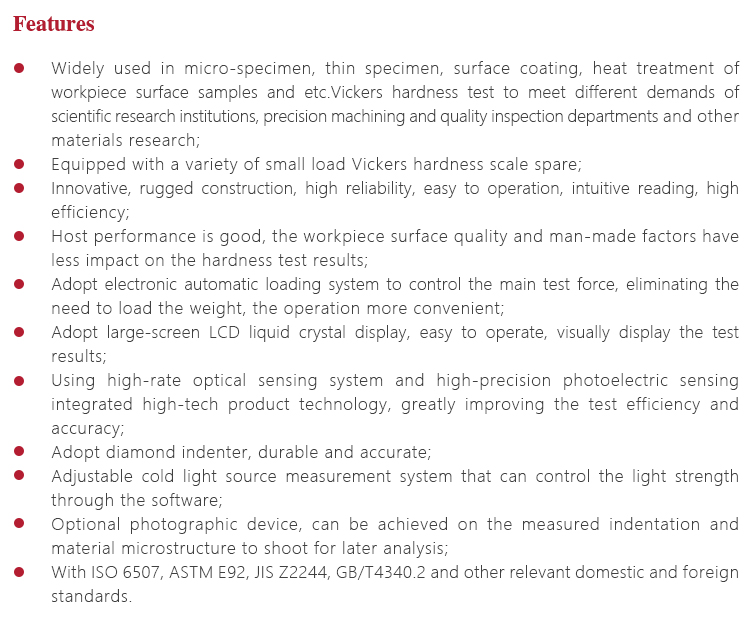 Instrument FeaturesWidely used in micro-specimen, thin specimen, surface coating, heat treatment of workpiece surface samples and etc.Vickers hardness test to meet different demands of scientific research institutions, precision machining and quality inspection departments and other materials research;