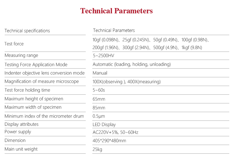 | Measuring range | 5~2500HV |
