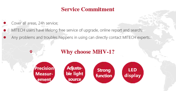 Product OverviewMitech MHV-1 micro hardness tester, based on the principle that positive quadrangular pyramid diamond indenter presses the surface of the sample to produce indentation.By measuring the diagonal length of the indentation to achieve the measurement of the hardness of the material can be for small specimens, thin specimens, surface coating, heat treatment of the workpiece surface Vickers hardness test. With stable performance, strong structure, high reliability, simple operation, adopt high magnification optical measurement system, adjust the cold light source, photoelectric sensing technology and computer-aided means it has a powerful function. It is widely used in the fields of metal processing, electronics industry, mold parts, watch manufacturing, engineering quality inspection and so on. It is an ideal hardness tester for material research and testing.
