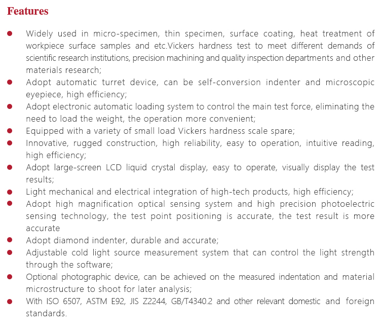 Instrument FeaturesWidely used in micro-specimen, thin specimen, surface coating, heat treatment of workpiece surface samples and etc.Vickers hardness test to meet different demands of scientific research institutions, precision machining and quality inspection departments and other materials research;