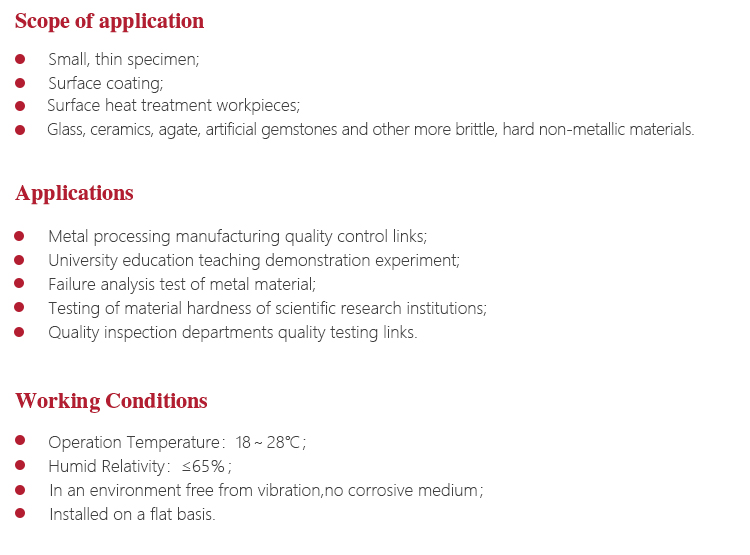 Instrument FeaturesWidely used in micro-specimen, thin specimen, surface coating, heat treatment of workpiece surface samples and etc.Vickers hardness test to meet different demands of scientific research institutions, precision machining and quality inspection departments and other materials research;