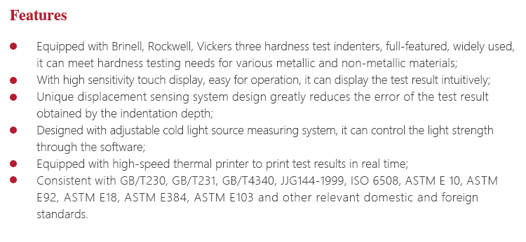 Instrument Featuresl Equipped with Brinell, Rockwell, Vickers three hardness test indenters, full-featured, widely used, it can meet hardness testing needs for various metallic and non-metallic materials.