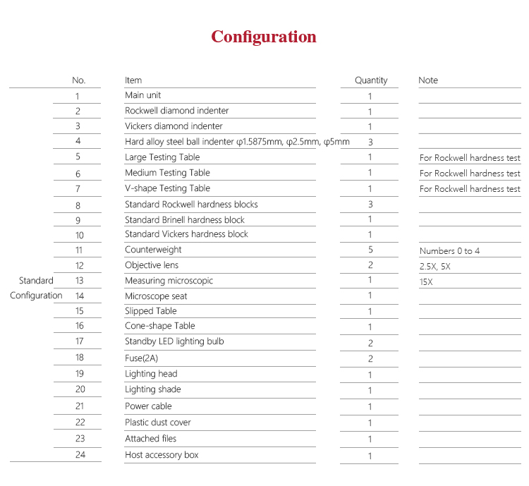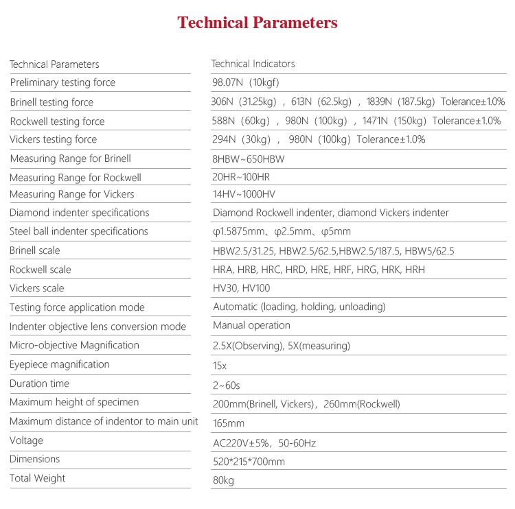| Vickers testing force | 294N(30kg), 980N(100kg)Tolerance±1.0% |