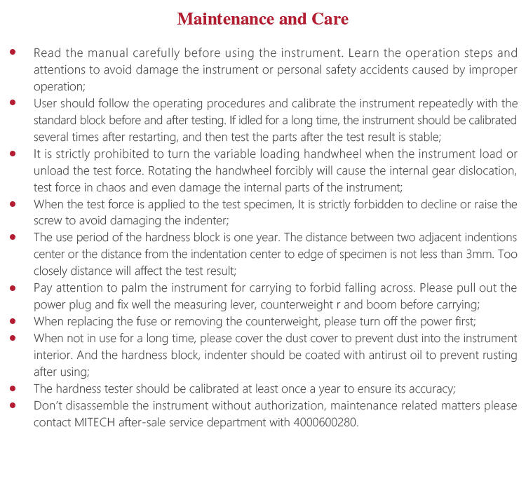 Instrument Maintenancel When not in use for a long time, please cover the dust cover to prevent dust into the instrument interior. And the hardness block, indenter should be coated with antirust oil to prevent rusting after using.