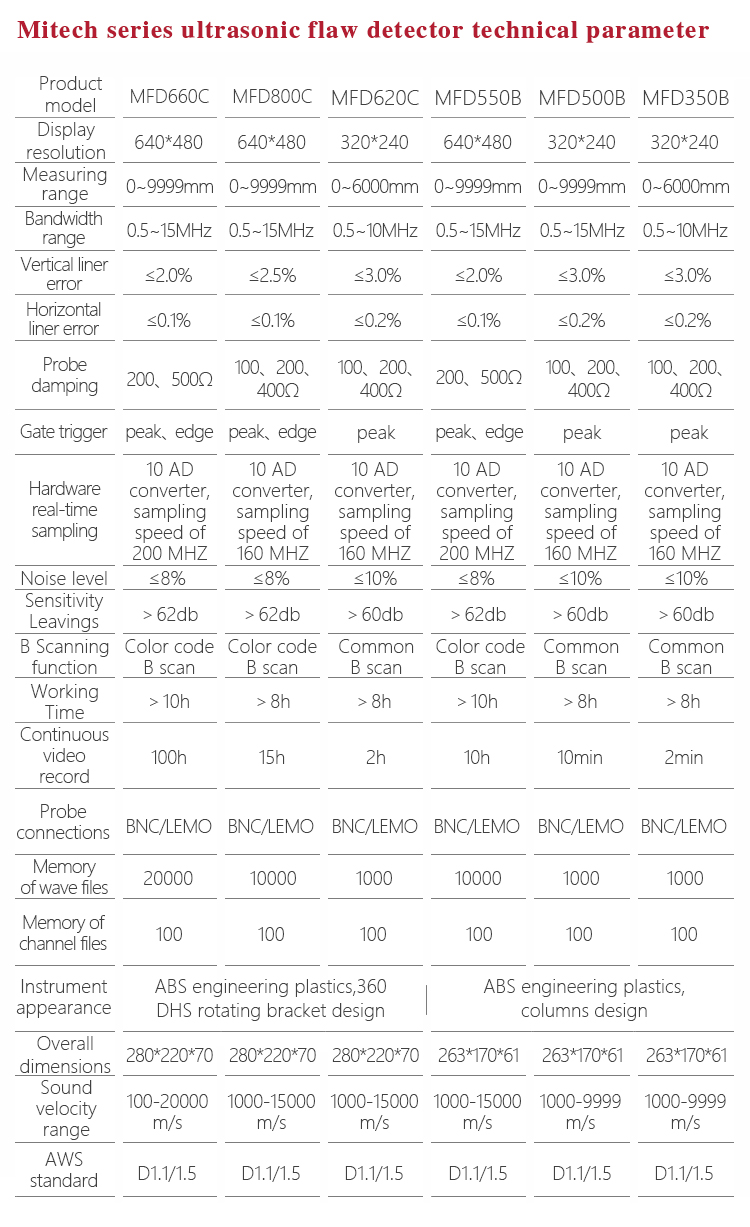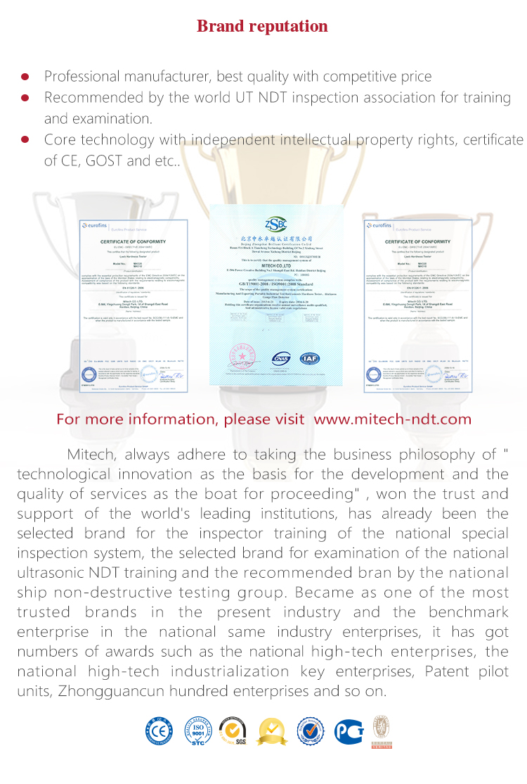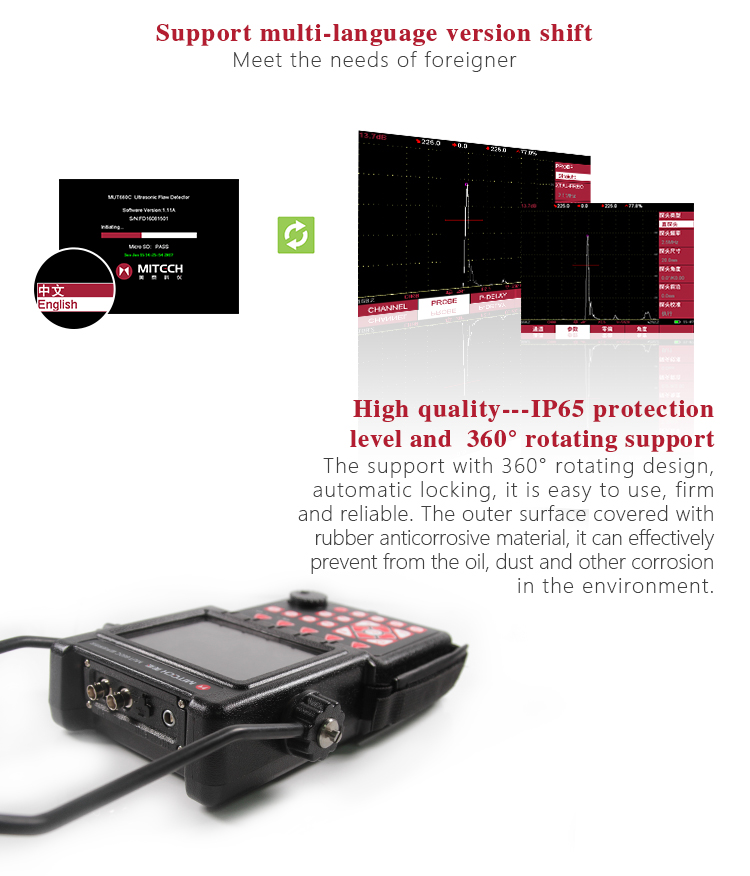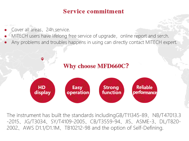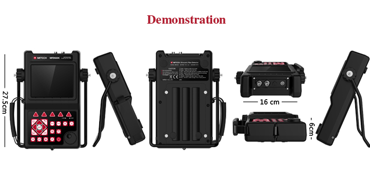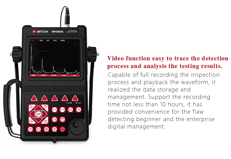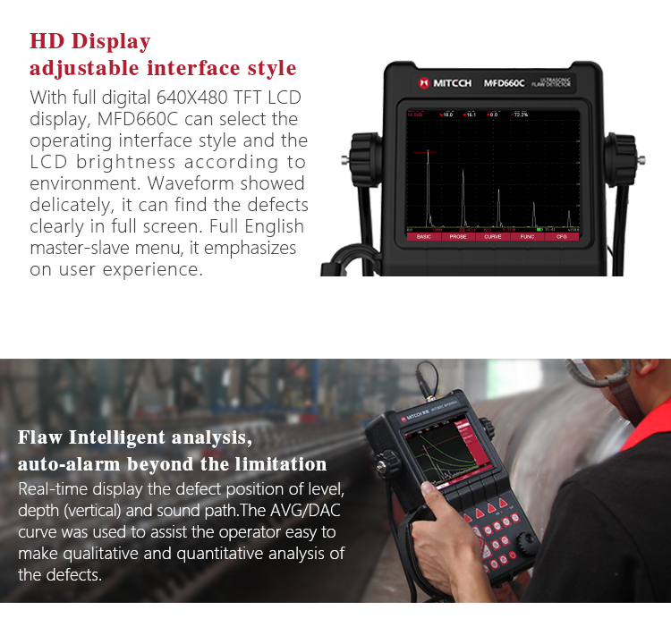Product OverviewMFD660C intelligent digital ultrasonic flaw detector, Mitech concentrated years meticulously developed premium product, has a lot of advantages like unique design, sophisticated manufacturing, convenient operation, powerful function. It had received customers' favored since its inception. It can test, orient, evaluate and diagnose various flaws such as crack, lard, air hole in workpiece’s interior swiftly and accurately without any destruction. With full digital 640X480 TFT LCD display, it can select the operating interface style and the LCD brightness according to environment. With humanizing interface design, the waveform show delicately. It can find the defects clearly in full screen. Single hand capable for holding operation, the curve making, probe calibration and other conventional operation can be completed automatically. Core processor CPU with 400M main frequency, it can complete the complex run quickly and realize intelligent defect analysis. Low power design with large capacity and high performance lithium ion battery module, it can work more than 10 hours continuously. Full English master-slave menu, emphasizing on user experience, collecting shortcut keys, digital shuttle rotary wheel, cross menu three operating ways in one body, customers with different habits can operate it freely. It supports many languages. Its waterproof, oil proof, dustproof function can achieve IP65 protection level. It is the necessary professional precision instrument for defect detection, quality control, on-line safety monitoring and life evaluation in fields of oil, chemical, metallurgy, shipbuilding, aviation, railways and so on.