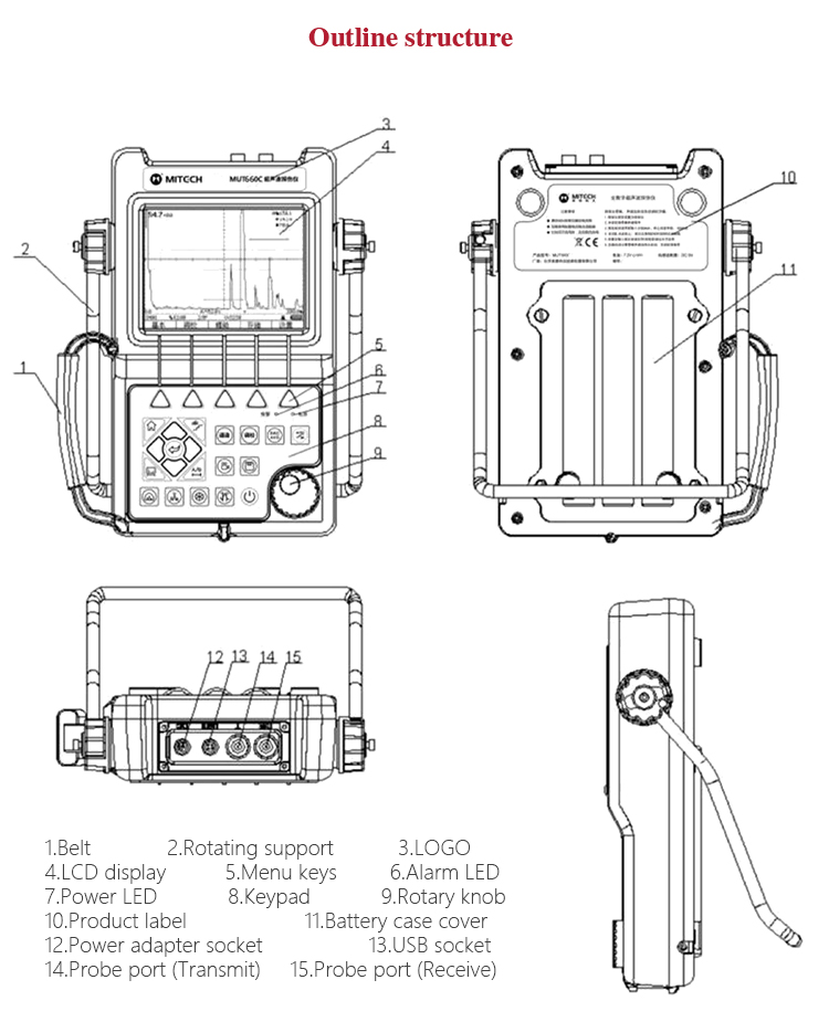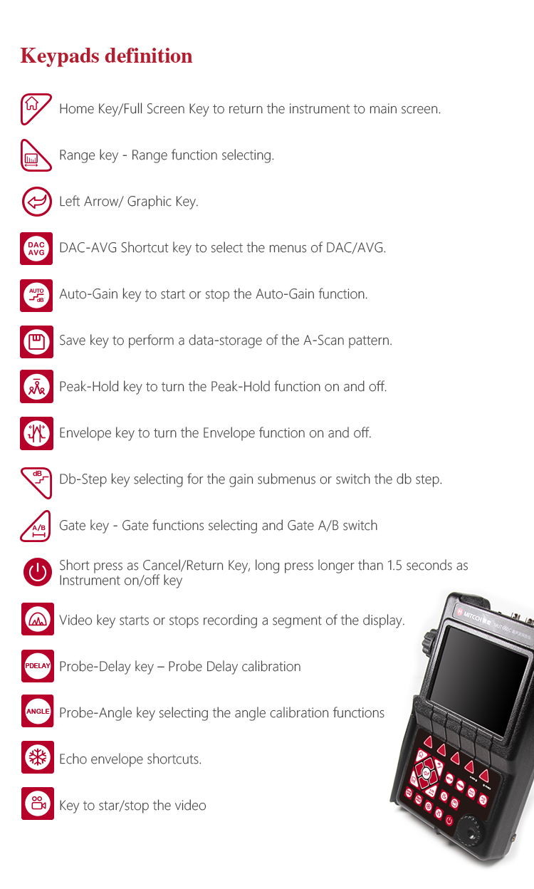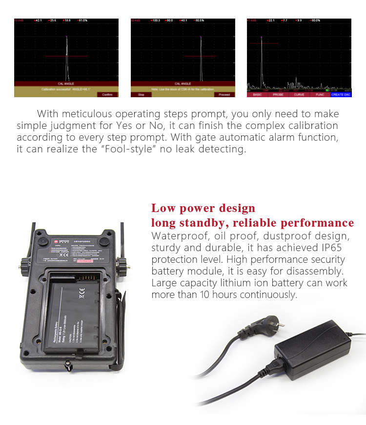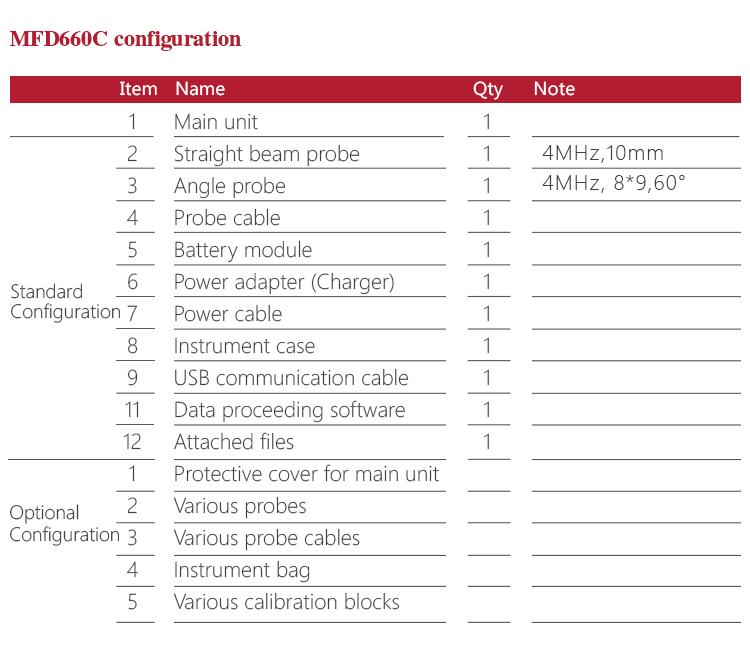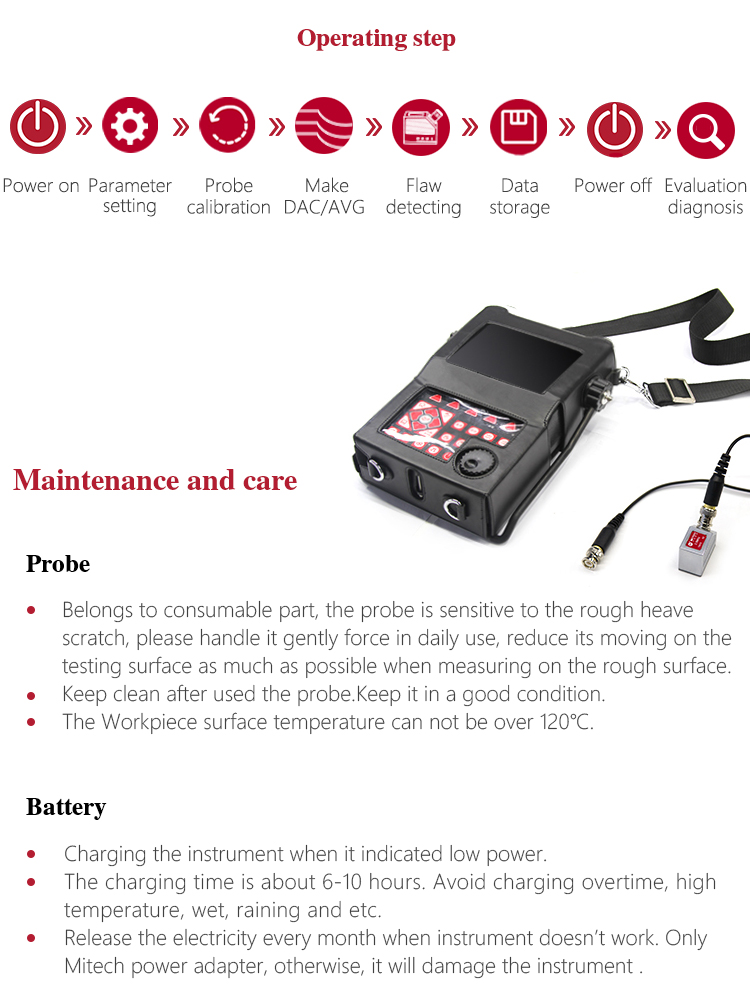 Product OverviewMFD660C intelligent digital ultrasonic flaw detector, Mitech concentrated years meticulously developed premium product, has a lot of advantages like unique design, sophisticated manufacturing, convenient operation, powerful function. It had received customers' favored since its inception. It can test, orient, evaluate and diagnose various flaws such as crack, lard, air hole in workpiece’s interior swiftly and accurately without any destruction. With full digital 640X480 TFT LCD display, it can select the operating interface style and the LCD brightness according to environment. With humanizing interface design, the waveform show delicately. It can find the defects clearly in full screen. Single hand capable for holding operation, the curve making, probe calibration and other conventional operation can be completed automatically. Core processor CPU with 400M main frequency, it can complete the complex run quickly and realize intelligent defect analysis. Low power design with large capacity and high performance lithium ion battery module, it can work more than 10 hours continuously. Full English master-slave menu, emphasizing on user experience, collecting shortcut keys, digital shuttle rotary wheel, cross menu three operating ways in one body, customers with different habits can operate it freely. It supports many languages. Its waterproof, oil proof, dustproof function can achieve IP65 protection level. It is the necessary professional precision instrument for defect detection, quality control, on-line safety monitoring and life evaluation in fields of oil, chemical, metallurgy, shipbuilding, aviation, railways and so on.