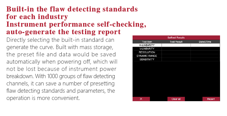 The instrument can automatically test the instrument probe’s combined performance indicators (including horizontal linearity error, vertical linearity error, resolution, dynamic range, sensitivity range, sensitivity margin) and can generate the testing report.