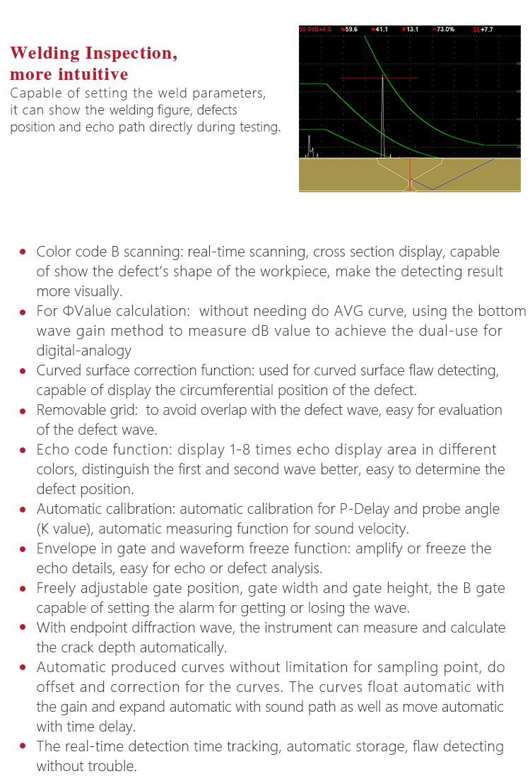 | Defect characterization | calculate the equivalent size of the flaw easily and quickly to facilitate the judgment of artificia |