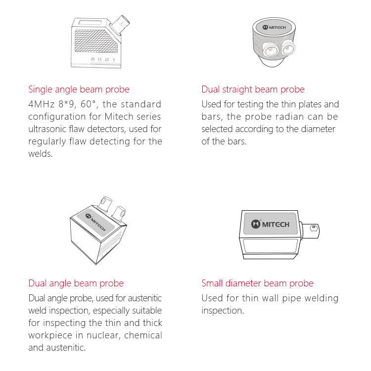 | Probe Type | straight beam probe, angle beam probe, dual element probe, through-transmit probe |