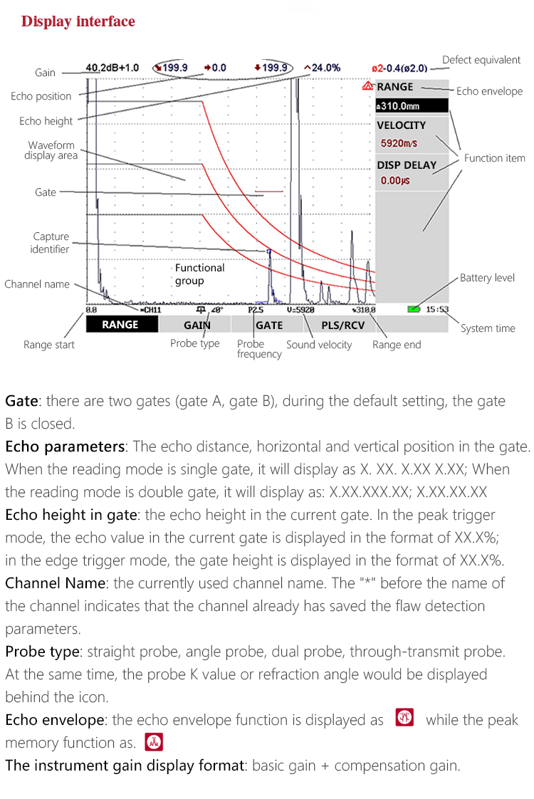 Instrument FeaturesGate position, gate width and gate height can be adjustable at will. The B gate can chose to set wave-getting alarm OR wave-losing alarm. The beep in gate and LED light can be alarmed or closed (the LED light alarm is very effective under the noise environment). The capture mark function can show the captured echo characteristics in the gate.