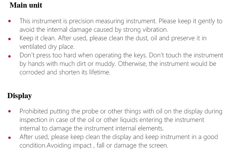 1. During pressing key operation, please not be too hard. Please not use the hands with much oil or mud for operating the instrument keypad to avoid affecting the keypad working life.