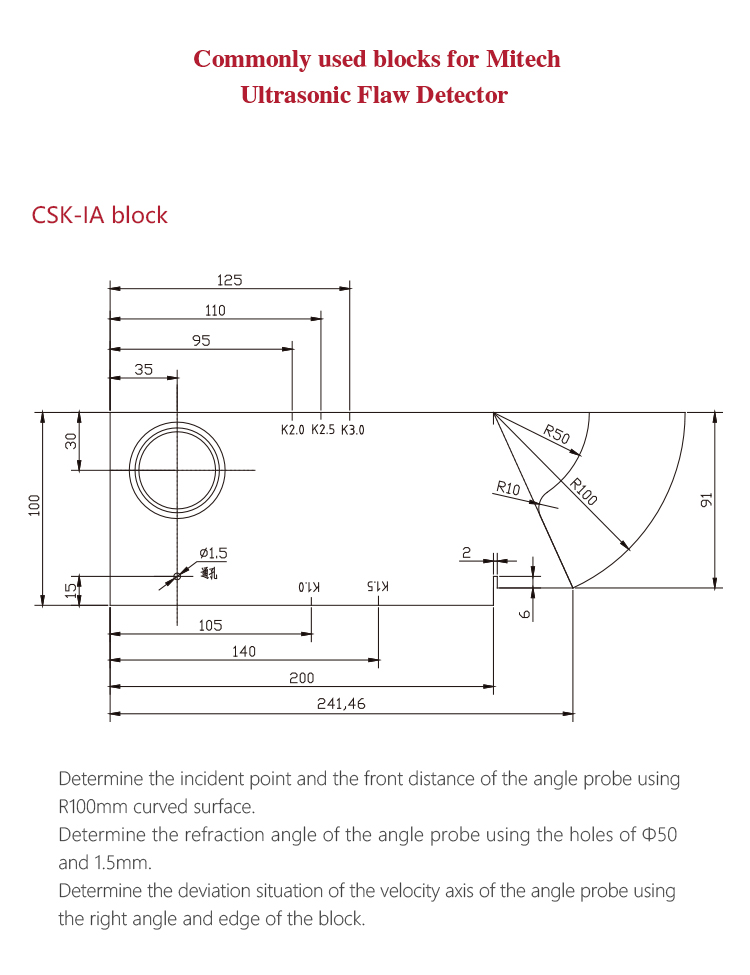 | Mitech standard Ultrasonic flaw detector Angle Probe with the parameters of 4MHz 8*9, 60°is the standard configuration. It is mainly composed of the piezoelectric crystal, damping block and wedge. The ultrasonic wave emitted from the crystal, through the wedge, it is converted to the transverse wave, and then incident to the measured workpiece. The wedge is made of organic glass, which can realize the waveform transformation. In order to avoid errors in calculating the defect distance, before using the angle probe, we need to calibrate its P-delay, angle and forefront. Through calibration, this part of the error can be automatically subtracted, thus improving the measurement accuracy .The Angle Beam Probe is suitable for normal flaw detecting like welds. | |