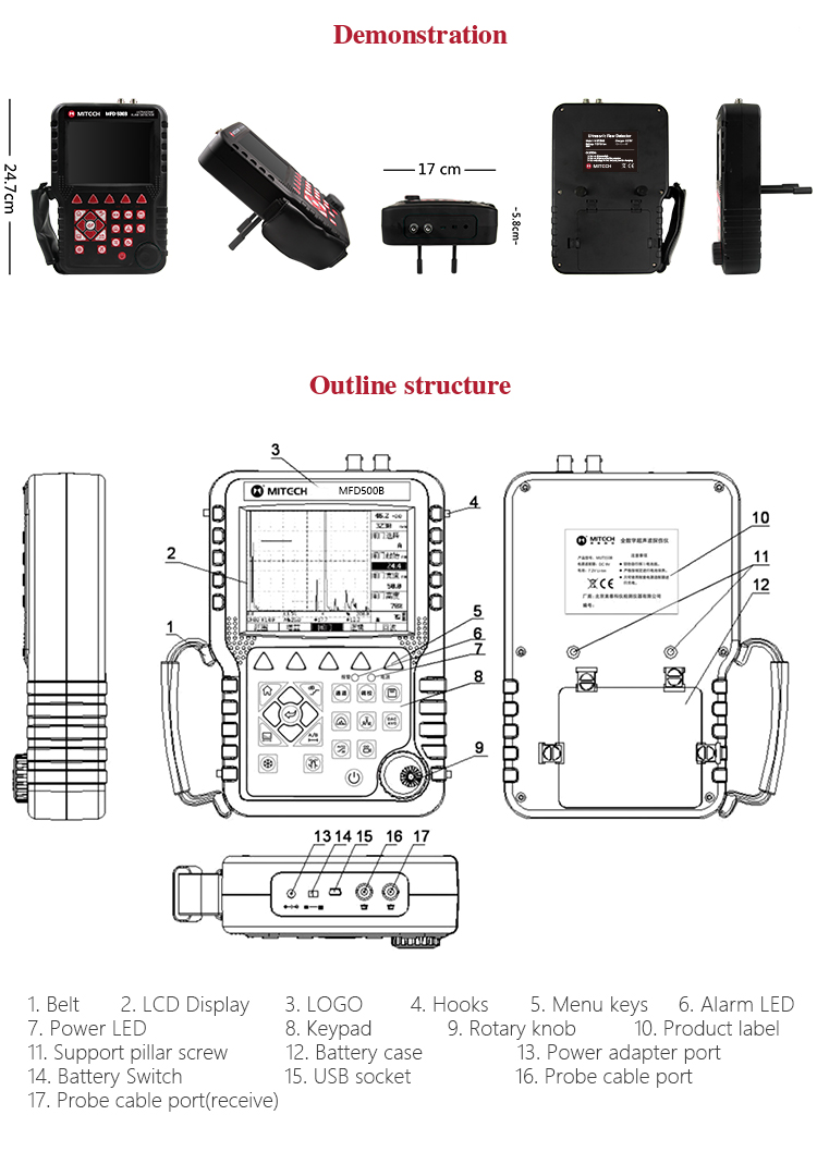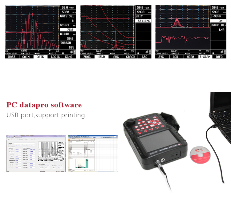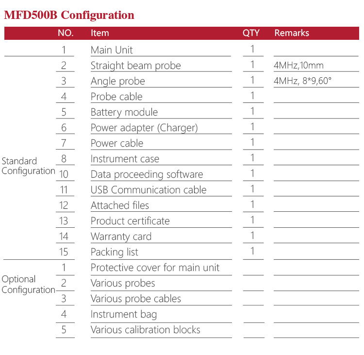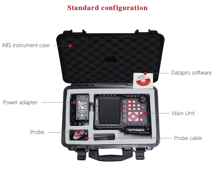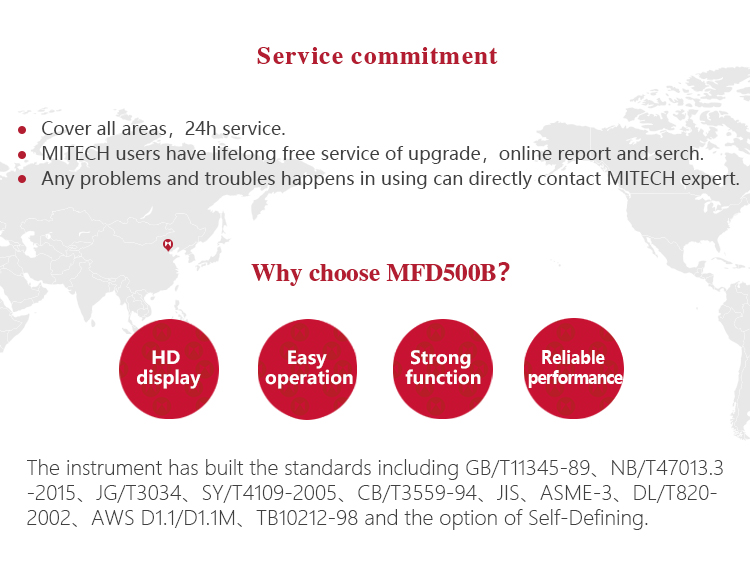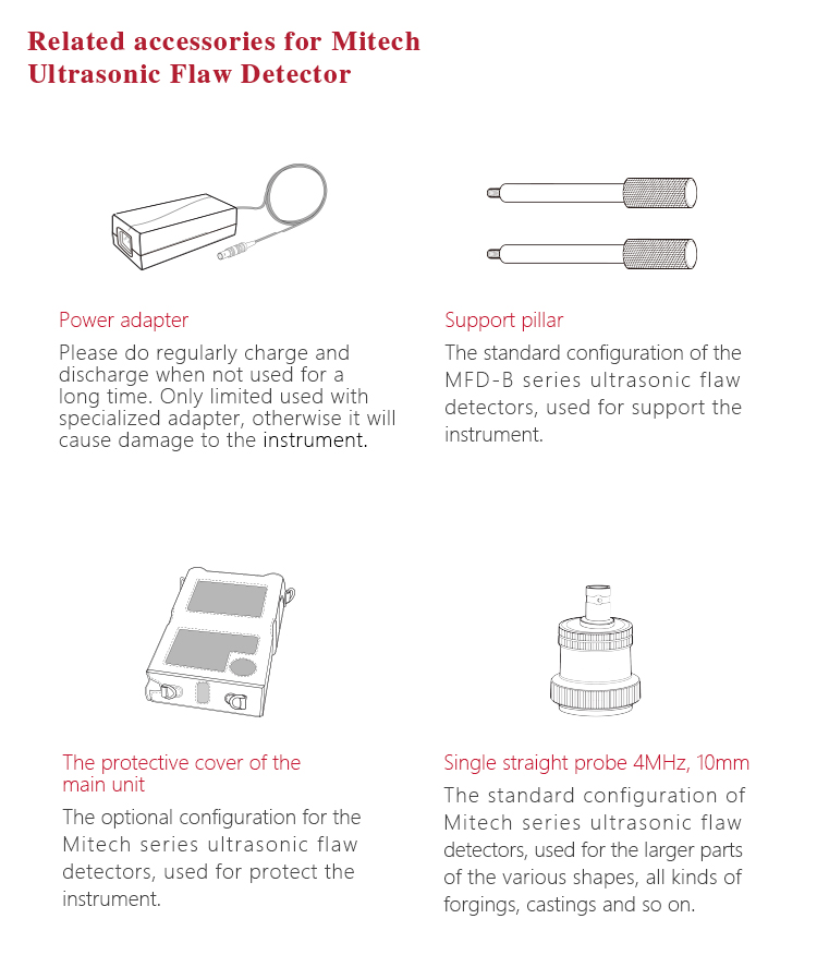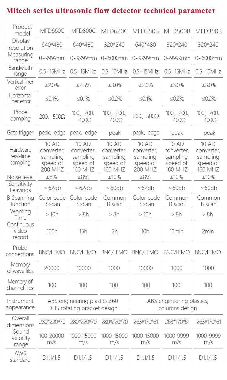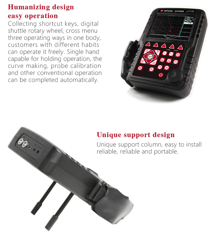 Product OverviewBased on ultrasonic principle, digital ultrasonic flaw detector MFD500B with 320*240 TFT LCD, it can test, orient, evaluate and diagnose various flaws such as crack, lard, air hole in workpiece’s interior swiftly and accurately without any destruction. It can be used in Laboratory as well as in engineering filed. With range of 0-9999mm, it can meet the requirement for general defect inspection in manufacturing industry, metallurgical industry, metal processing industry, chemical industry and so on. Low power design with large capacity and high performance lithium battery module, it can be long standby for months. High quality with low price, it is the first choice for the practical economic model for ultrasonic testing equipment.