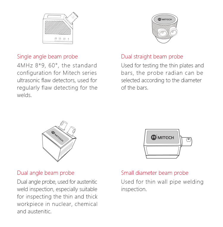| Probe Type | straight beam probe, angle beam probe, dual element probe, through-transmit probe |